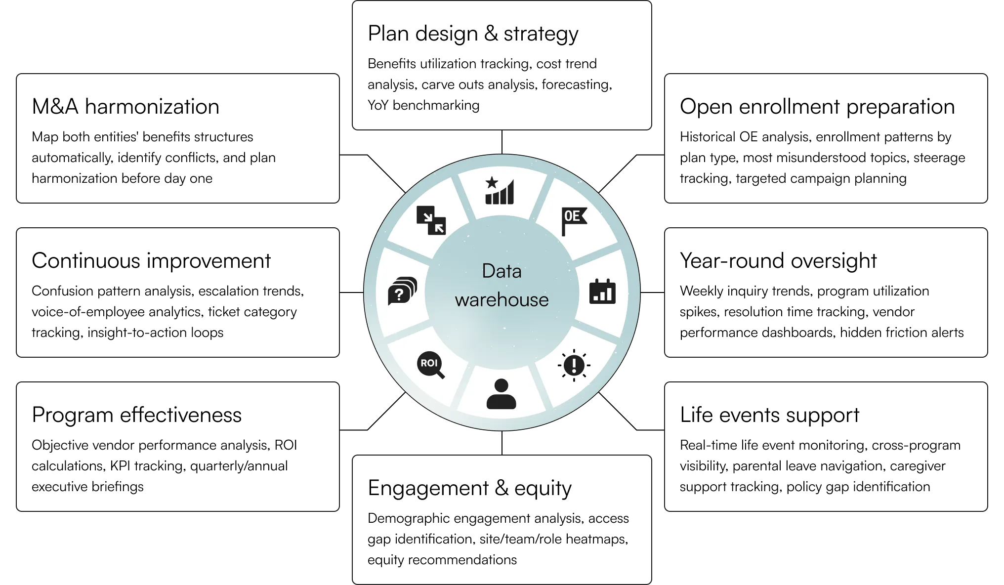 Historical OE analysis, enrollment patterns by plan type, most misunderstood topics, steerage tracking, targeted campaign planning